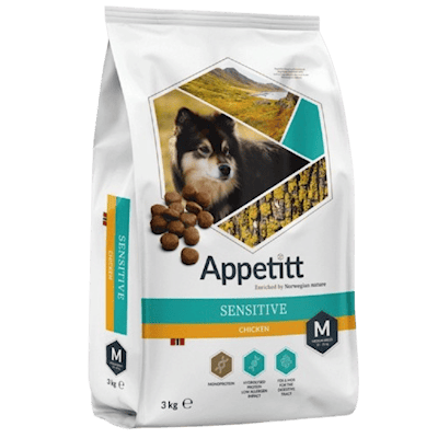 Appetite Sensitive Chicken Medium Breed är lämpligt för känsliga hundar av medelstora raser (10-25 kg), från 1 års ålder med normal aktivitetsnivå.