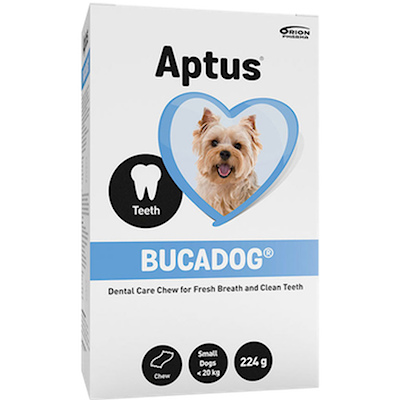 - Aptus Bucadog tuggbitar minskar bildningen av plack, motverkar dålig andedräkt & upprätthåller jämvikten i munnens normala mikroflora.