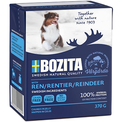 - Bozita Hund Nat Reindeer Gelé är läckra måltider med bitar i gele är tillagade av naturliga ingredienser utan vete, socker, soja eller färgämnen.