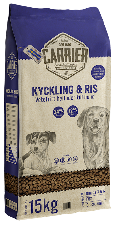 - CARRIER KYCKLING & RIS är ett vetefritt och köttbaserat helfoder till normalt aktiva hundar av alla raser.