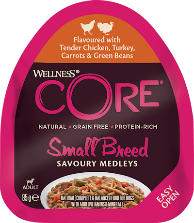 - Wellness CORE Dog Adult Savoury Medleys Small Breed Chicken, Turkey, Carrots & Green Beans.