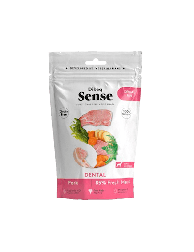 Dibaq Sense Pig Dental Snack är en halvmjuk godbit gjord på färskt griskött, potatis och kelp.