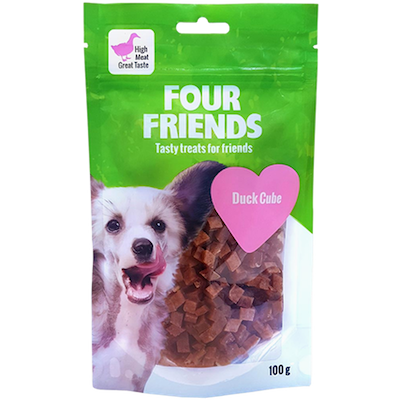 - FourFriends Dog/Cat Duck Cube är ett lättsmält, oemotståndligt hundgodis som passar lika bra för katter.