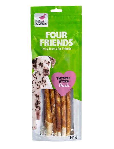 - Four Friends Twisted Stick Duck tuggrulle innehåller ett tuggben av (kohud) 85% & ankkött 13%.