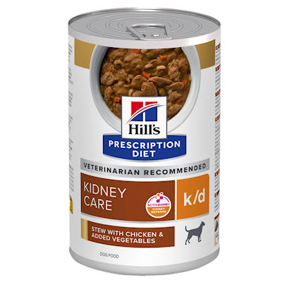 Steget före med deras bästa i fokus Hill's PRESCRIPTION DIET k/d Kidney Care Stew hundfoder med kyckling och grönsaker är ett dietfoder till hund speciellt sammansatt av Hill’s nutritionister och veterinärer för att hjälpa till med att skydda din hunds njurfunktion.