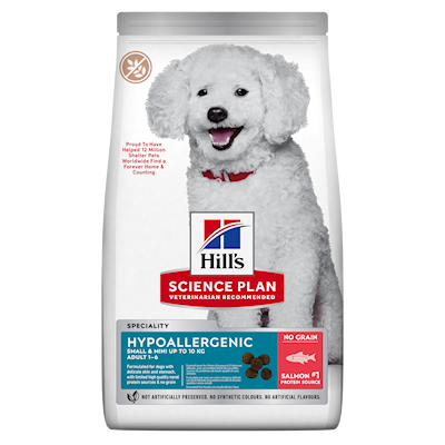 - Hill's Science Plan Hypoallergenic Small & Mini Adult hundfoder med lax är ett välsmakande torrfoder för små vuxna hundar 1-6 år.