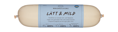 - Magnussons Lätt & Mild är ett smakrikt komplett våtfoder för hundar med lite mindre energi och mer fibrer.