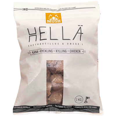 Magstödjande helfoder med Kycklingkött - Hellä Kyckling är en nytt färskfoder från MUSH - Hellä®Kyckling fryst hundmat med Kyckling 90 % (kött, muskelmage, lever,hjärta), fermenterade grönsaker 5,8 % är ett helt nytt fryst helfoder för hundar som innehåller fermenterade grönsaker med - Lactobacilius & Omega 3.