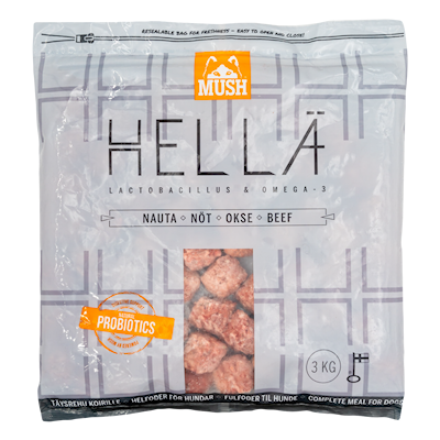 Magstödjande helfoder med Nötkött - Hellä Nöt är en nytt färskfoder från MUSH - Hellä®Nöt fryst hundmat med Nötkreatur 90,5 % (kött, vom, hjärta,strupe, lever), fermenterade grönsaker 6 % är ett helt nytt fryst helfoder för hundar som innehåller fermenterade grönsaker med - Lactobacilius & Omega 3.