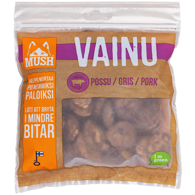 - Mush Vainu Grisgodis är gjort på färska finska råvaror som är varsamt torkade.