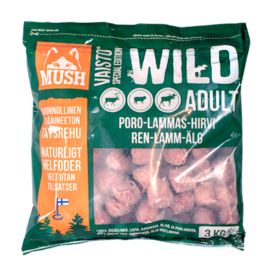 Allergivänligt råfoder för hund - Mush Barf Vaisto Wild Ren med lamm & älg - Färskfryst spannmålsfritt helfoder från Mush med en blandning av ren, lamm & älg.