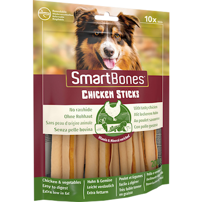 - SmartBones® Chicken Sticks är hälsosamma, tuggbitar som är skonsamma mot tandköttet utan råhud.
